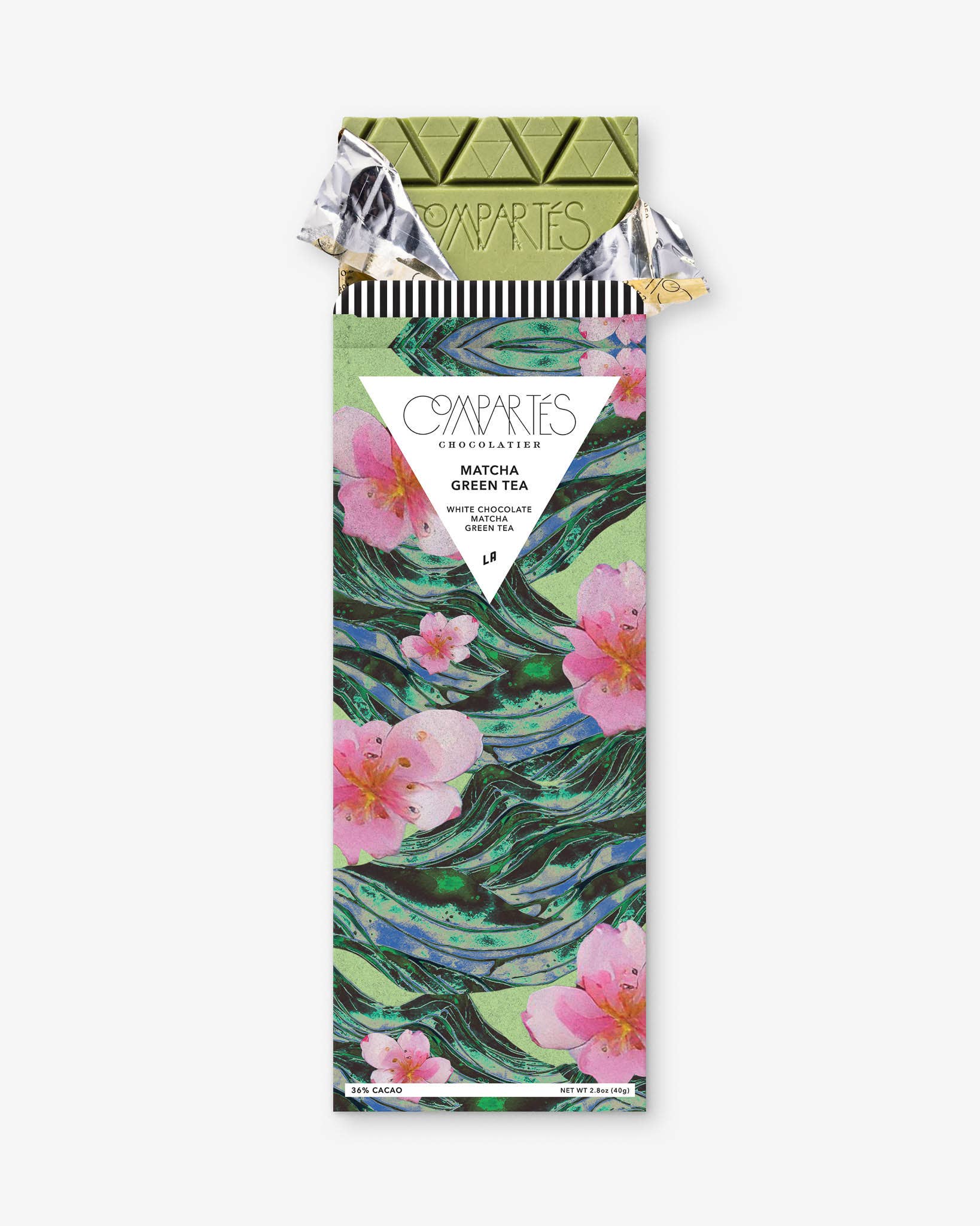 Compartés Matcha white chocolate bar transforms the trendiest drink in Los Angeles into chocolate bar form! Premium ceremonial grade matcha tea is mixed with luxury white chocolate and turns this chocolate bar green. Infused with only the best matcha from Japan. This chocolate bar features waves and a traditional, but modern Japanese inspired design on the cover. Handmade in our Los Angeles chocolate kitchens.
