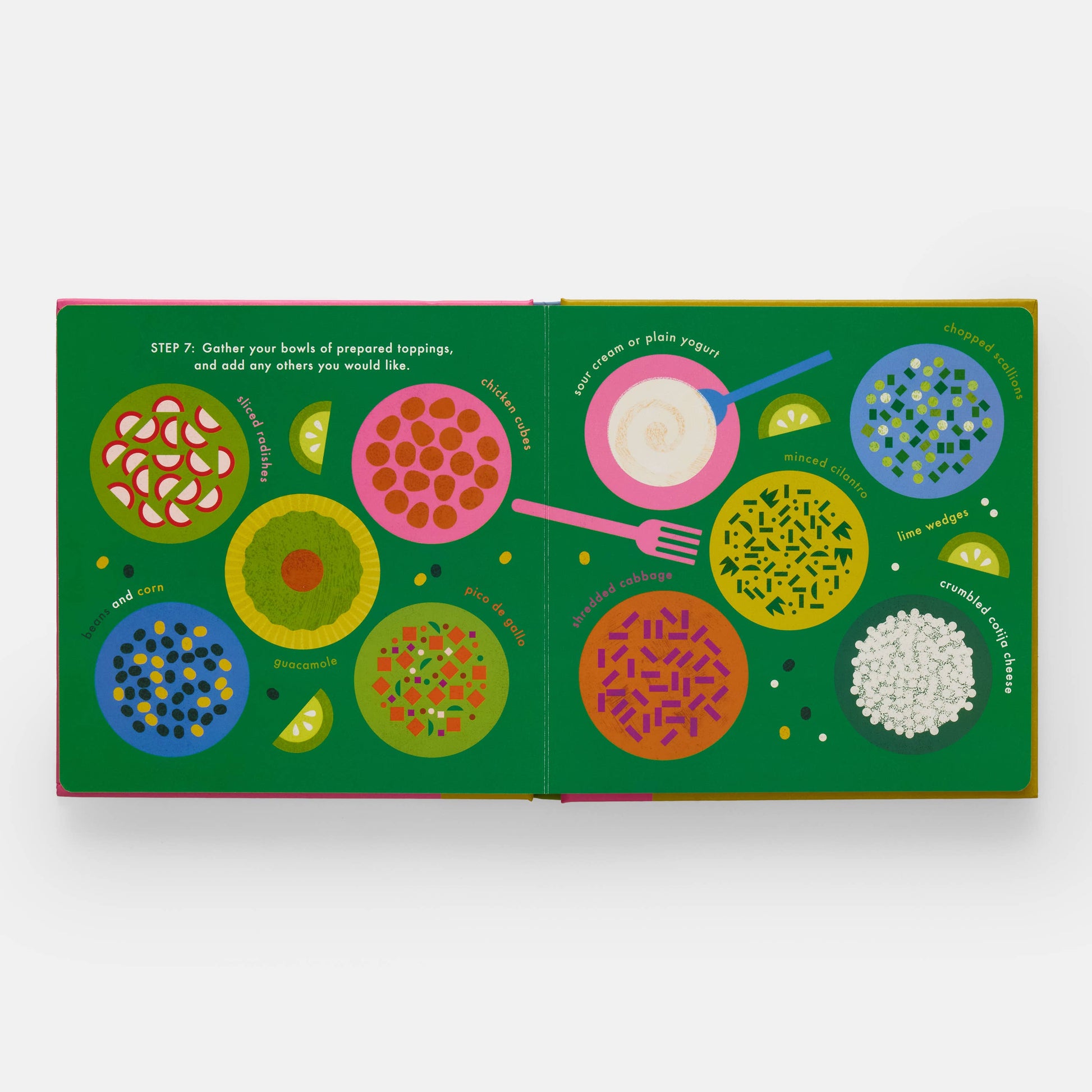 For kids who cook in a play kitchen or a real kitchen, this interactive recipe book invites readers to chop the vegetables, mash the avocado, warm the tortillas, and more - all inside the book!