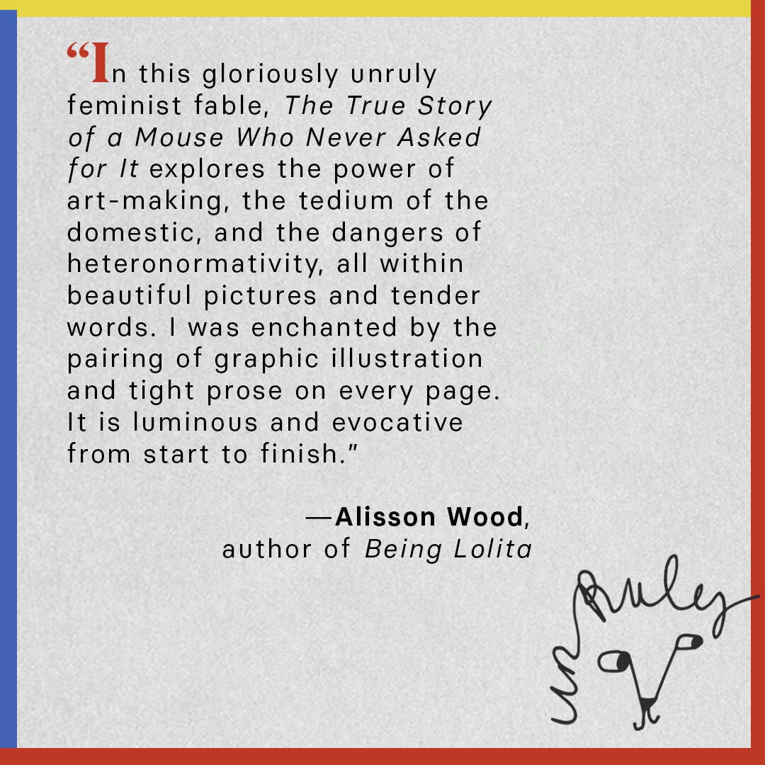 "In this gloriously unruly feminist fable, The True Story of a Mouse Who Never Asked for It explores the power of art-making, the tedium of the domestic, and the dangers of heteronormativity, all within beautiful pictures and tender words. I was enchanted by the pairing of graphic illustration and tight prose on every page. It is luminous and evocative from start to finish." —Alisson Woods, author of Being Lolita